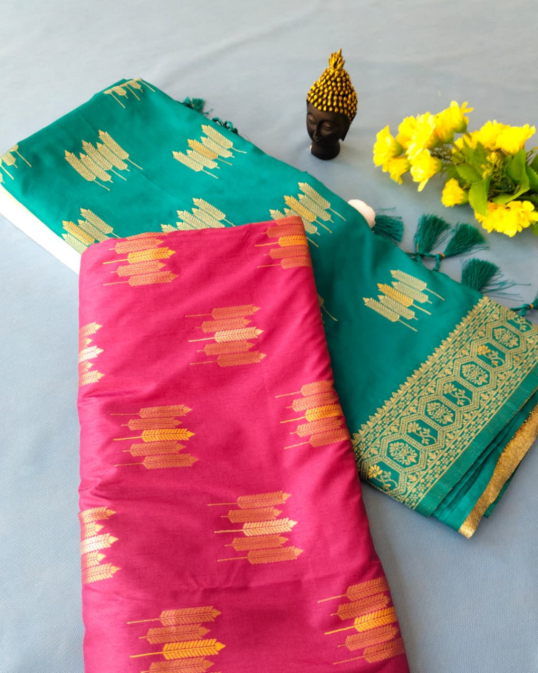 Product Details Fabric: Dola Silk Colours: Teal Green & Rani Pink Motifs: Gold woven leaf...